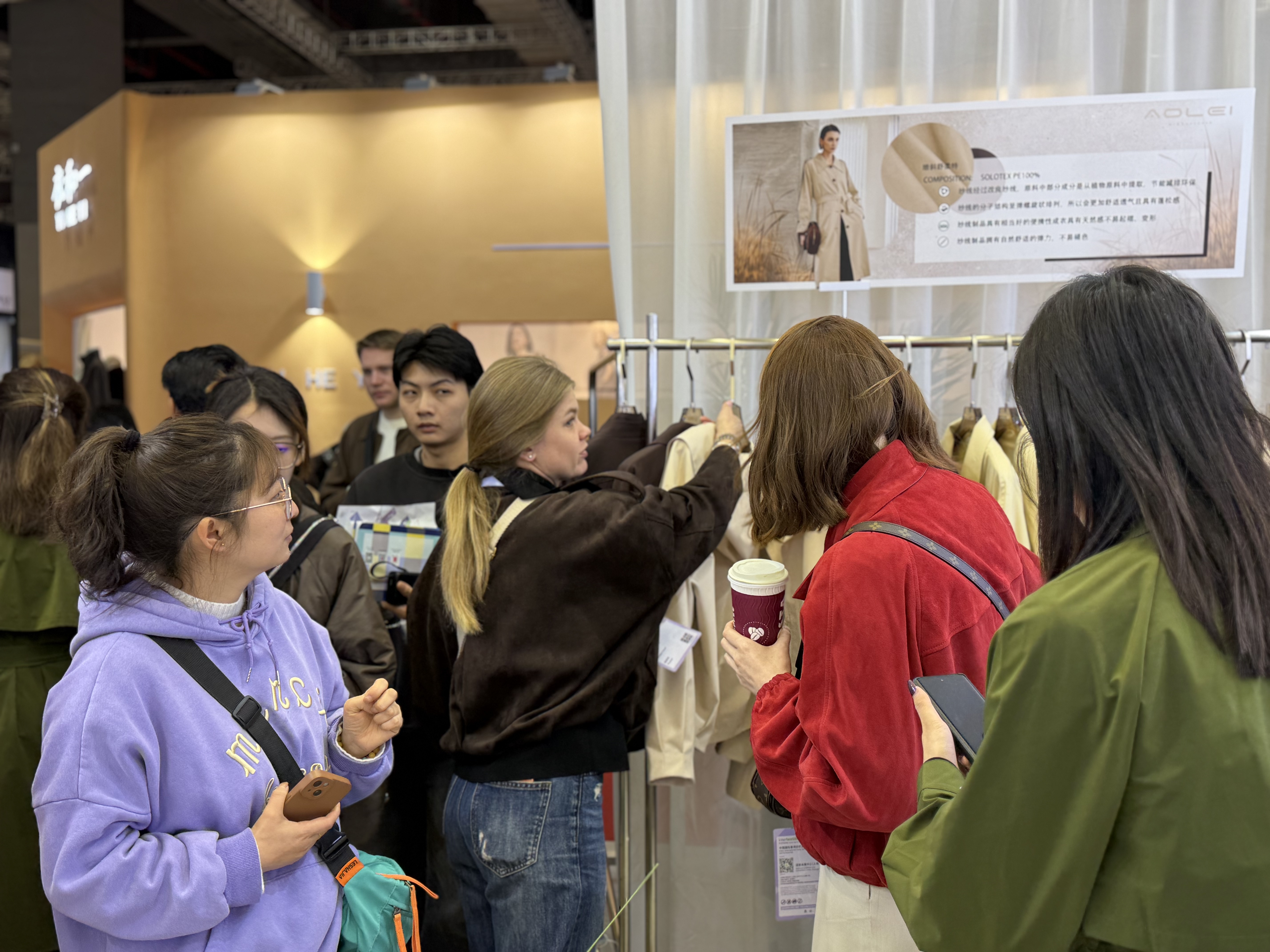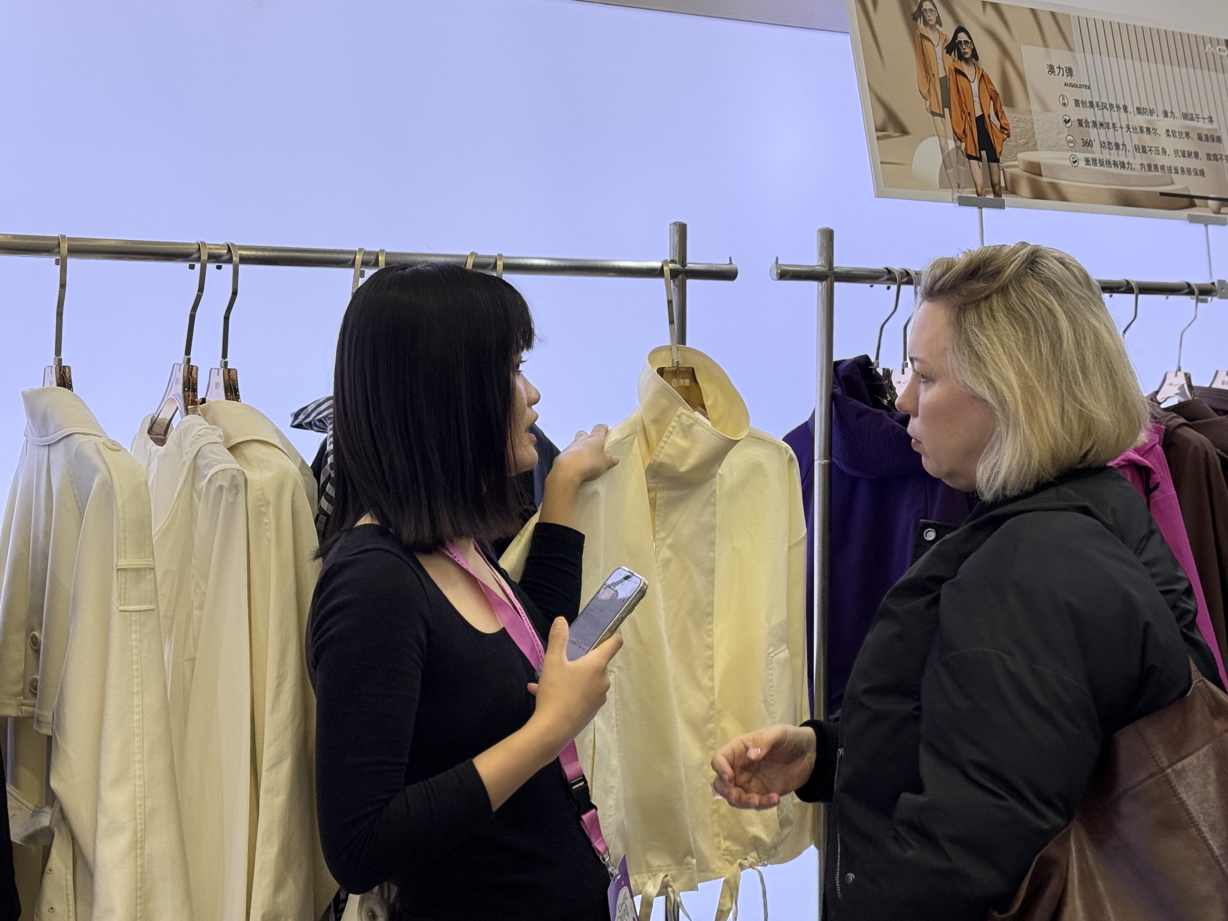 展位上,人流不断。有合作多年的老朋友,有第一次见面的新客户,也有不少国外采购商被吸引过来,驻足交流、翻看样衣、询问细节。
