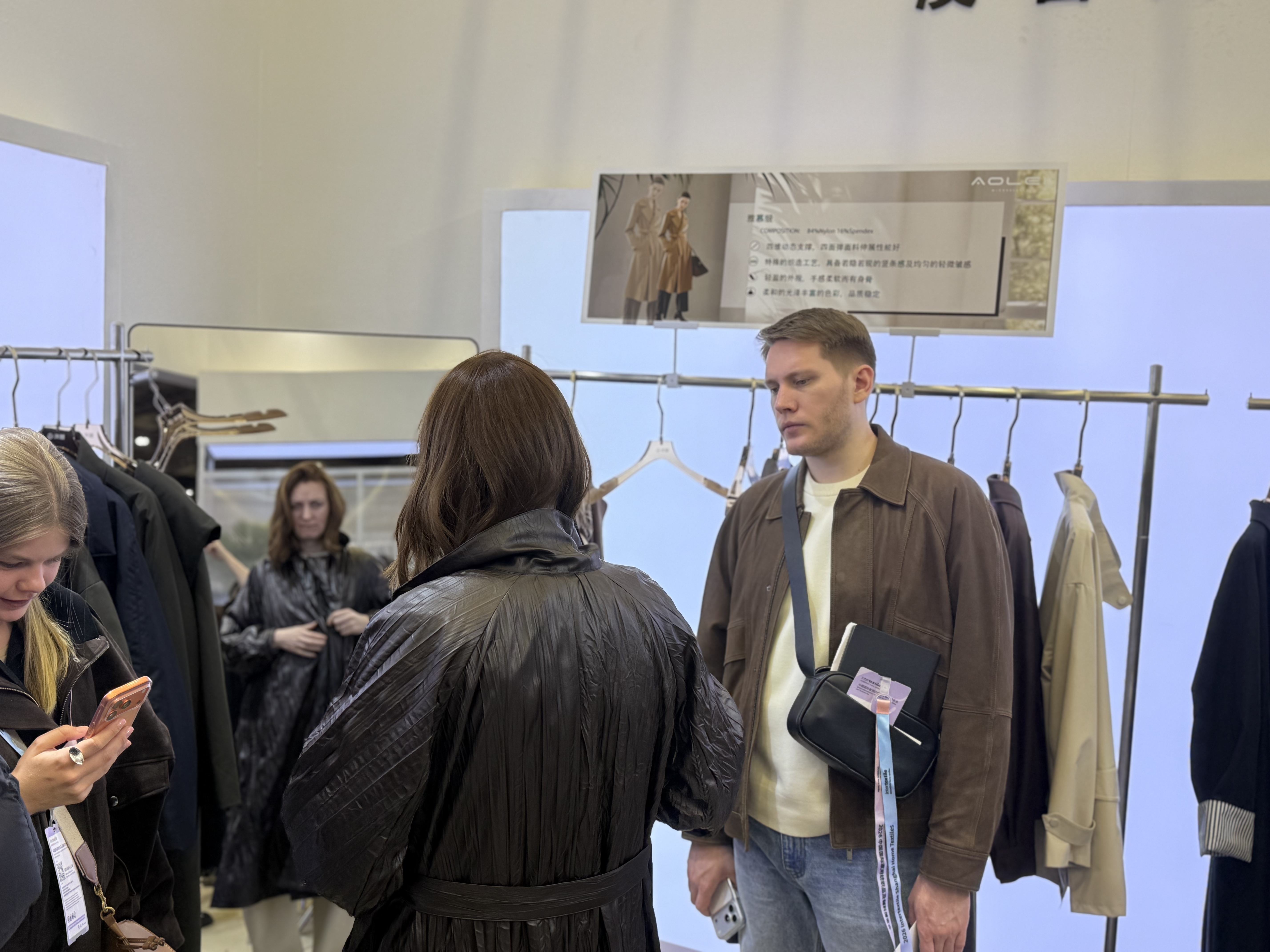 展位上,人流不断。有合作多年的老朋友,有第一次见面的新客户,也有不少国外采购商被吸引过来,驻足交流、翻看样衣、询问细节。